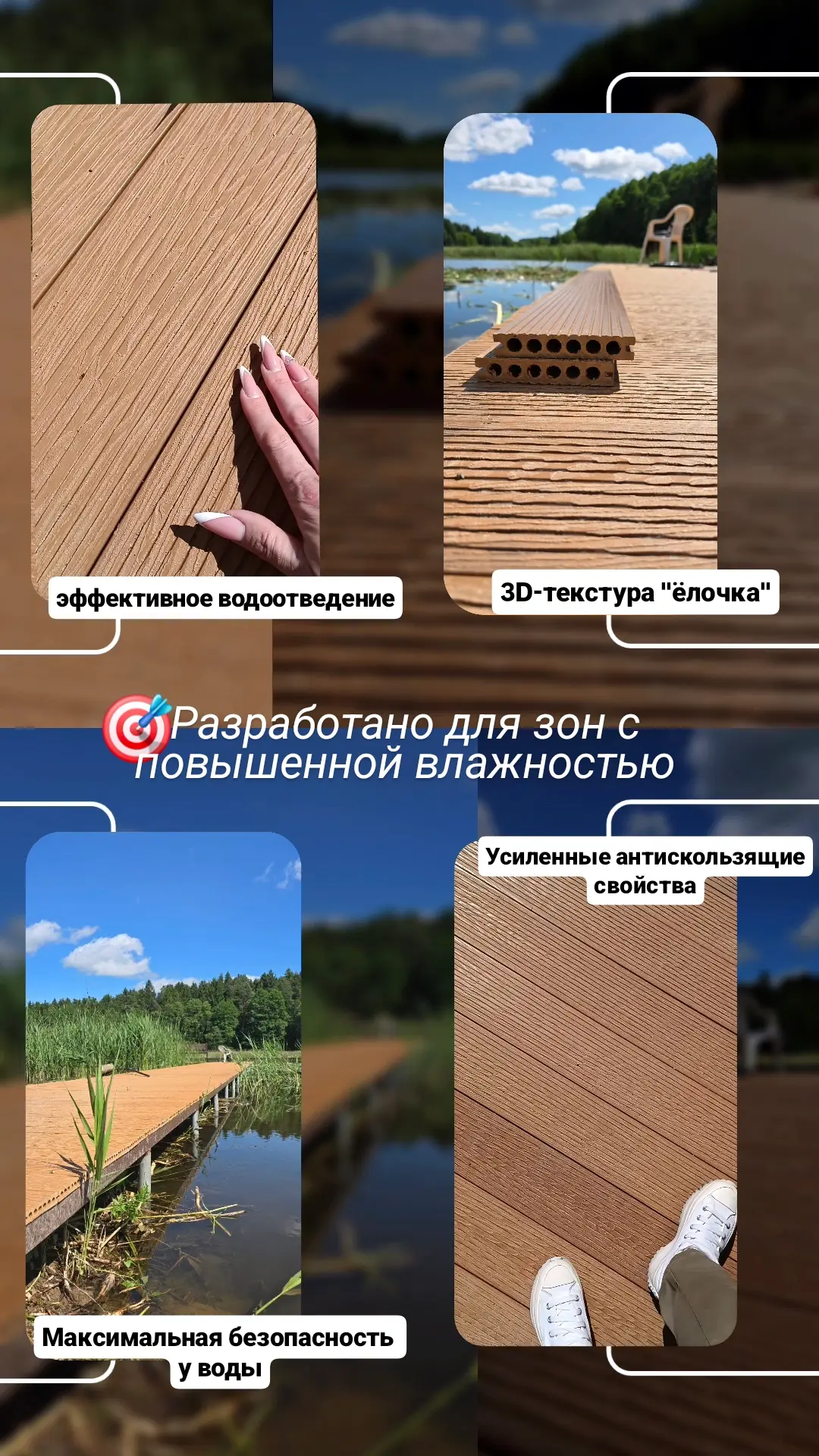 Материал не впитывает влагу, не разбухает, не гниет, не требует обработки антисептиками. Отлично подходит для зон с постоянным контактом с водой.